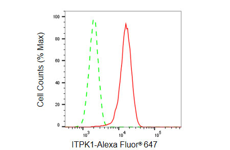 Flow cytometric analysis of ITPK1 expression in HepG2 cells using ITPK1 antibody. Green, isotype control; red, ITPK1.