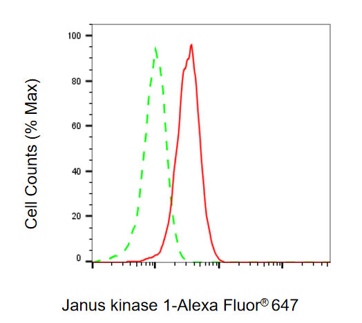 Flow cytometric analysis of Janus kinase 1 expression in HepG2 cells using Janus kinase 1 antibody. Green, isotype control; red, Janus kinase 1.