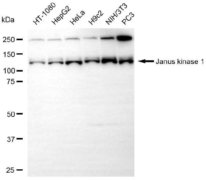 Western blotting analysis using janus kinase 1 antibody. Total cell lysates (30 μg) from various cell lines were loaded and separated by SDS-PAGE. The blot was incubated with janus kinase 1 antibody and HRP-conjugated goat anti-rabbit secondary antibody respectively.