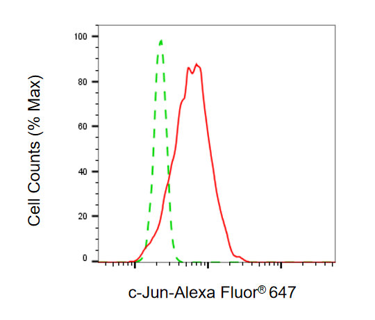 Flow cytometric analysis of c-Jun expression in HT-1080 cells using c-Jun antibody. Green, isotype control; red, c-Jun.