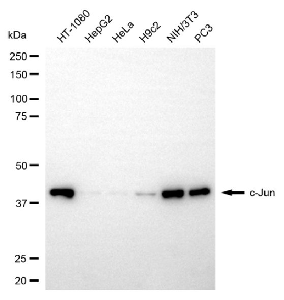 Western blotting analysis using c-Jun antibody. Total cell lysates (30 μg) from various cell lines were loaded and separated by SDS-PAGE. The blot was incubated with c-Jun antibody and HRP-conjugated goat anti-rabbit secondary antibody respectively.