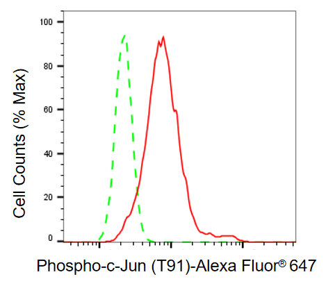 Flow cytometric analysis of phospho-c-Jun (T91) expression in C2C12 cells using phospho-c-Jun (T91) antibody. Green, isotype control; red, phospho-c-Jun (T91).