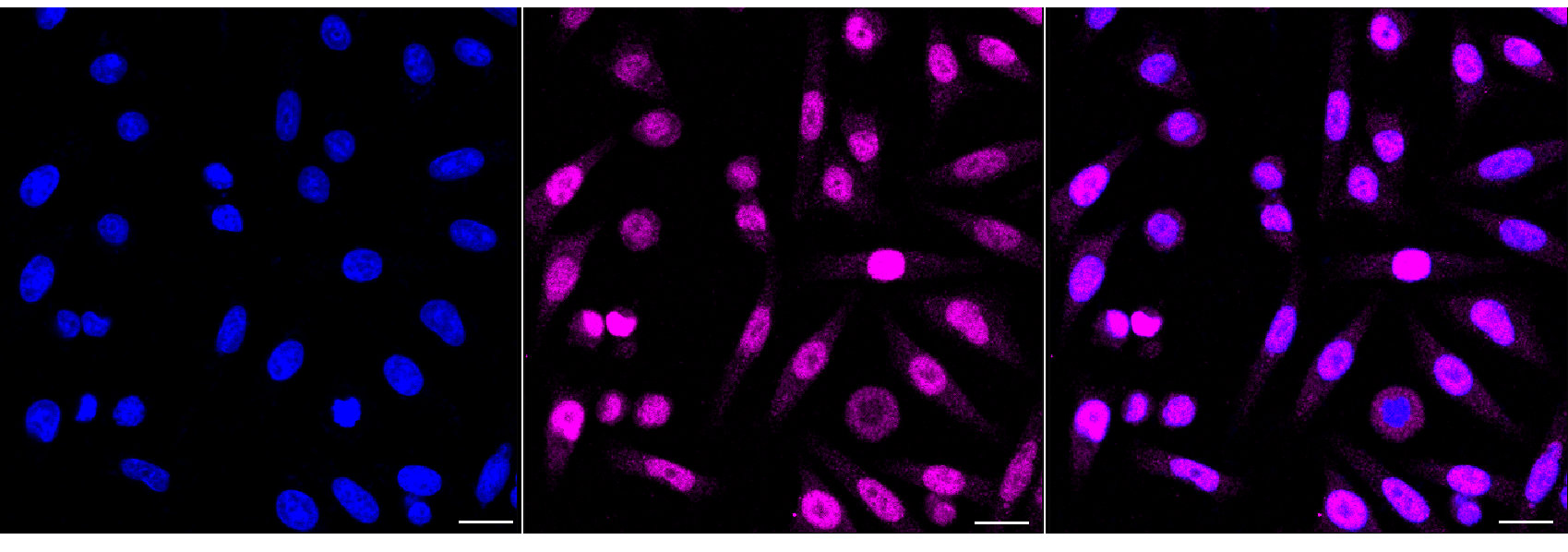 Immunocytochemical staining of HepG2 cells with JUND antibody. Nuclei were stained blue with DAPI; JUND was stained magenta with Alexa Fluor? 647. Images were taken using Leica stellaris 5. Protein abundance based on laser Intensity and smart gain: Medium. Scale bar, 20 μm.