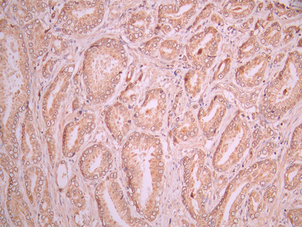 IHC image of CSB-RA151954A0HU diluted at 1:100 and staining in paraffin-embedded human prostate cancer performed on a Leica BondTM system. After dewaxing and hydration, antigen retrieval was mediated by high pressure in a citrate buffer (pH 6.0). Section was blocked with 10% normal goat serum 30min at RT. Then primary antibody (1% BSA) was incubated at 4°C overnight. The primary is detected by a Goat anti-rabbit polymer IgG labeled by HRP and visualized using 0.05% DAB.