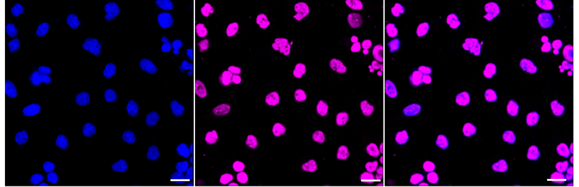 Immunocytochemical staining of HeLa cells with KHDRBS1 antibody. Nuclei were stained blue with DAPI; KHDRBS1 was stained magenta with Alexa Fluor? 647. Images were taken using leica stellaris 5. Protein abundance based on laser intensity and smart gain: High. Scale bar: 20 μm.