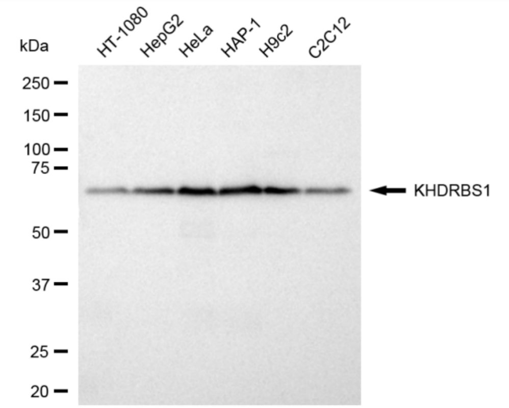 Western blotting analysis using KHDRBS1 antibody. Total cell lysates (30 μg) from various cell lines were loaded and separated by SDS-PAGE. The blot was incubated with KHDRBS1 antibody and HRP-conjugated goat anti-rabbit secondary antibody respectively.