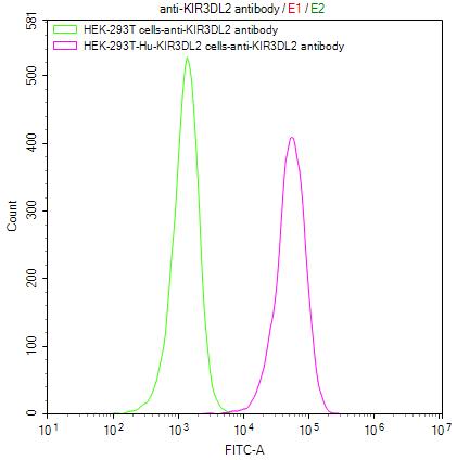 Untransfected HEK-293T cells (green line) and transfected Human KIR3DL2 HEK-293T stable cells (red line) were stained with anti-KIR3DL2 recombinant antibody (2μg/1*106cells), washed and then followed by FITC-conjugated anti-Human IgG Fc antibody and analyzed with flow cytometry.