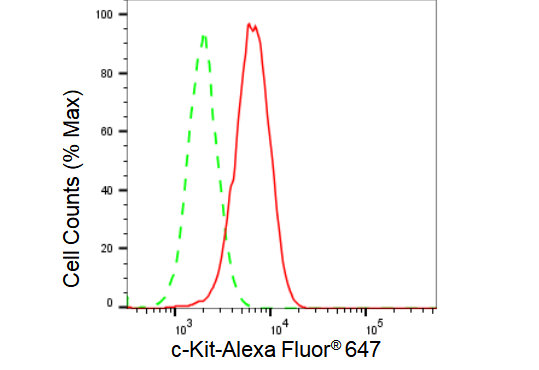 Flow cytometric analysis of c-Kit expression in HAP-1 cells using c-Kit antibody. Green, isotype control; red, c-Kit.