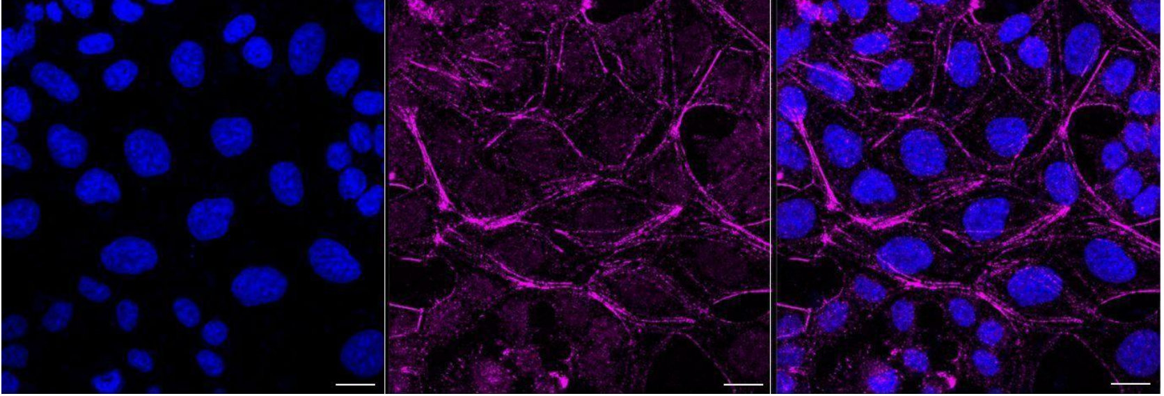 Immunocytochemical staining of HAP-1 cells with c-Kit antibody. Nuclei were stained blue with DAPI; c-Kit was stained magenta with Alexa Fluor? 647. Images were taken using Leica stellaris 5. Protein abundance based on laser Intensity and smart gain: Medium. Scale bar, 20 μm.