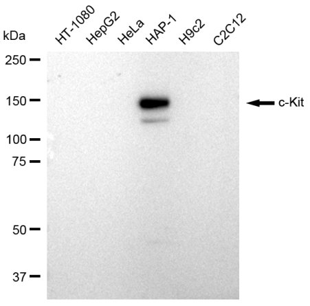 Western blotting analysis using c-Kit antibody. Total cell lysates (30 μg) from various cell lines were loaded and separated by SDS-PAGE. The blot was incubated with c-Kit antibody and HRP-conjugated goat anti-rabbit secondary antibody respectively.