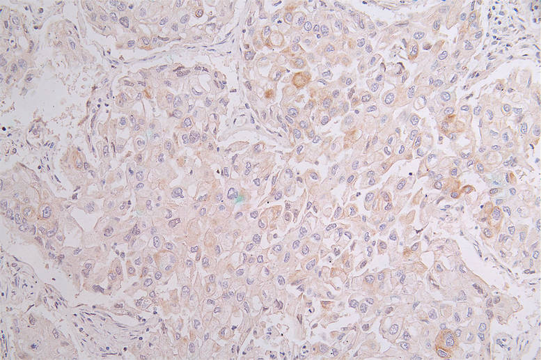 IHC image of CSB-RA582749A0HU diluted at 1:50 and staining in paraffin-embedded human lung cancer performed on a Leica BondTM system. After dewaxing and hydration, antigen retrieval was mediated by high pressure in a citrate buffer (pH 6.0). Section was blocked with 10% normal goat serum 30min at RT. Then primary antibody (1% BSA) was incubated at 4°C overnight. The primary is detected by a Goat anti-rabbit polymer IgG labeled by HRP and visualized using 0.34% DAB.