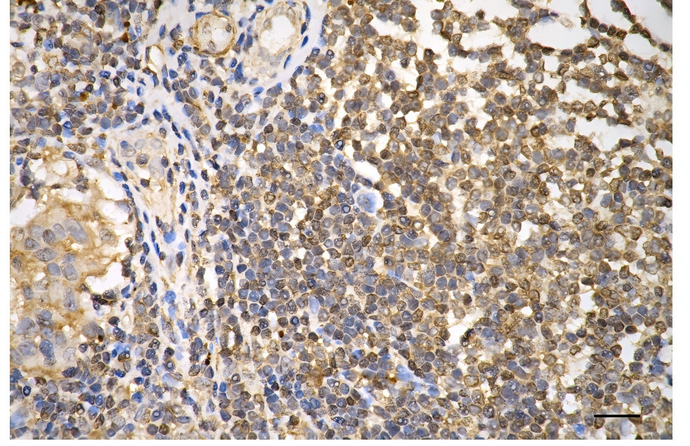 Immunohistochemistry was performed on paraffin-embedded human breast carcinoma using keratin 18 antibody. Antigen retrieval was done in sodium citrate buffer (pH 6.0). DAB was used for detection, with hematoxylin counterstaining. Images were acquired using a Nikon Ci-L Plus microscope (40× objective). Scale bar: 25 μm.