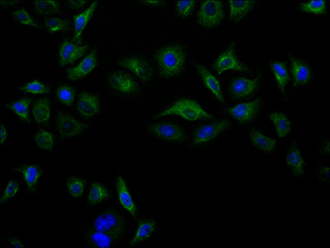 Immunofluorescence staining of Hela cell with CSB-RA564549A0HU at 1:50, counter-stained with DAPI. The cells were fixed in 4% formaldehyde, permeabilized using 0.2% Triton X-100 and blocked in 10% normal Goat Serum. The cells were then incubated with the antibody overnight at 4°C. The secondary antibody was Alexa Fluor 488-congugated AffiniPure Goat Anti-Rabbit IgG(H+L).