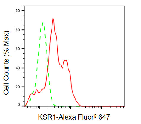 Flow cytometric analysis of KSR1 expression in HeLa cells using KSR1 antibody. Green, isotype control; red, KSR1.