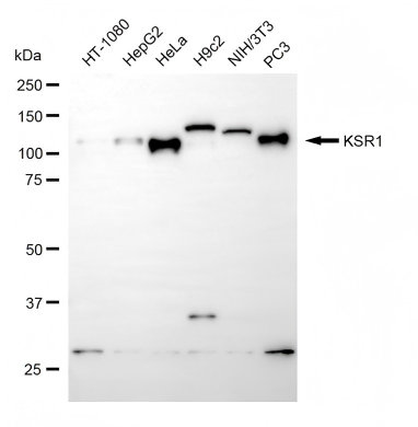 Western blotting analysis using KSR1 antibody. Total cell lysates (30 μg) from various cell lines were loaded and separated by SDS-PAGE. The blot was incubated with KSR1 antibody and HRP-conjugated goat anti-rabbit secondary antibody respectively.