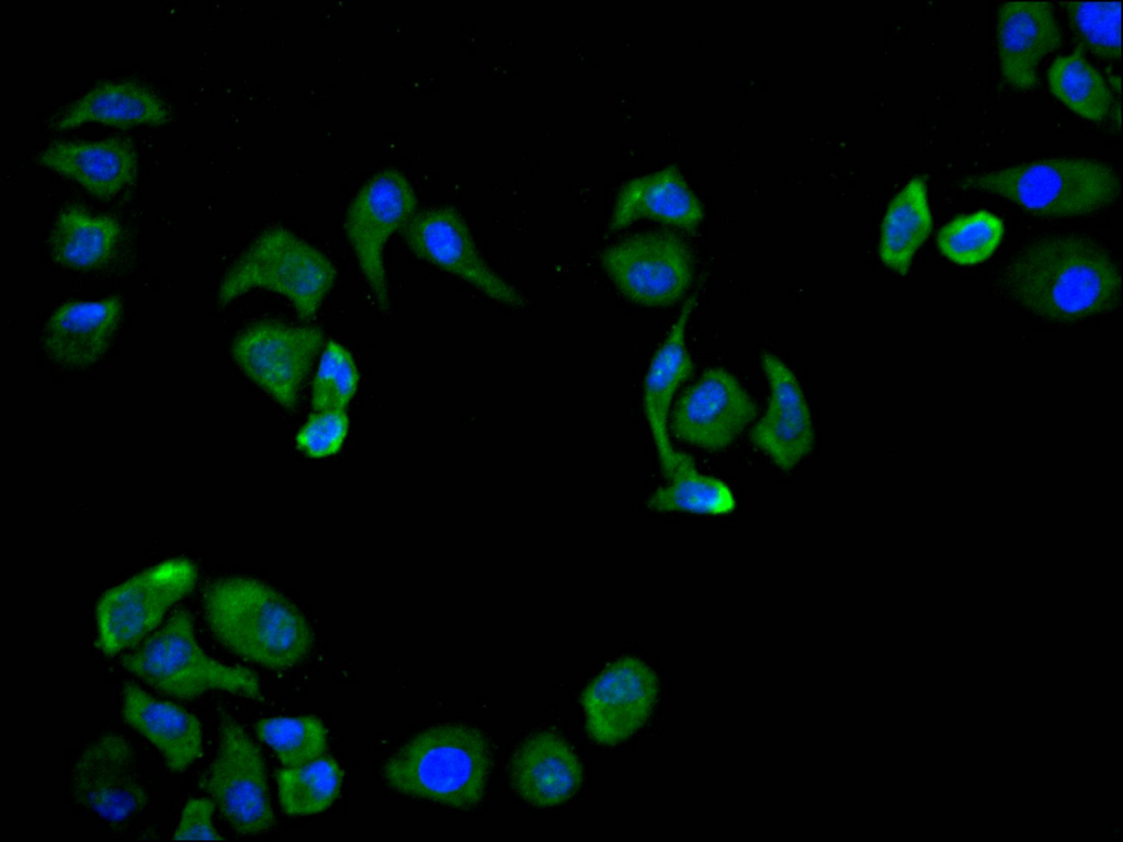Immunofluorescence staining of Hela cell with CSB-RA261042A0HU at 1:50, counter-stained with DAPI. The cells were fixed in 4% formaldehyde, permeabilized using 0.2% Triton X-100 and blocked in 10% normal Goat Serum. The cells were then incubated with the antibody overnight at 4°C. The secondary antibody was Alexa Fluor 488-congugated AffiniPure Goat Anti-Rabbit IgG(H+L).