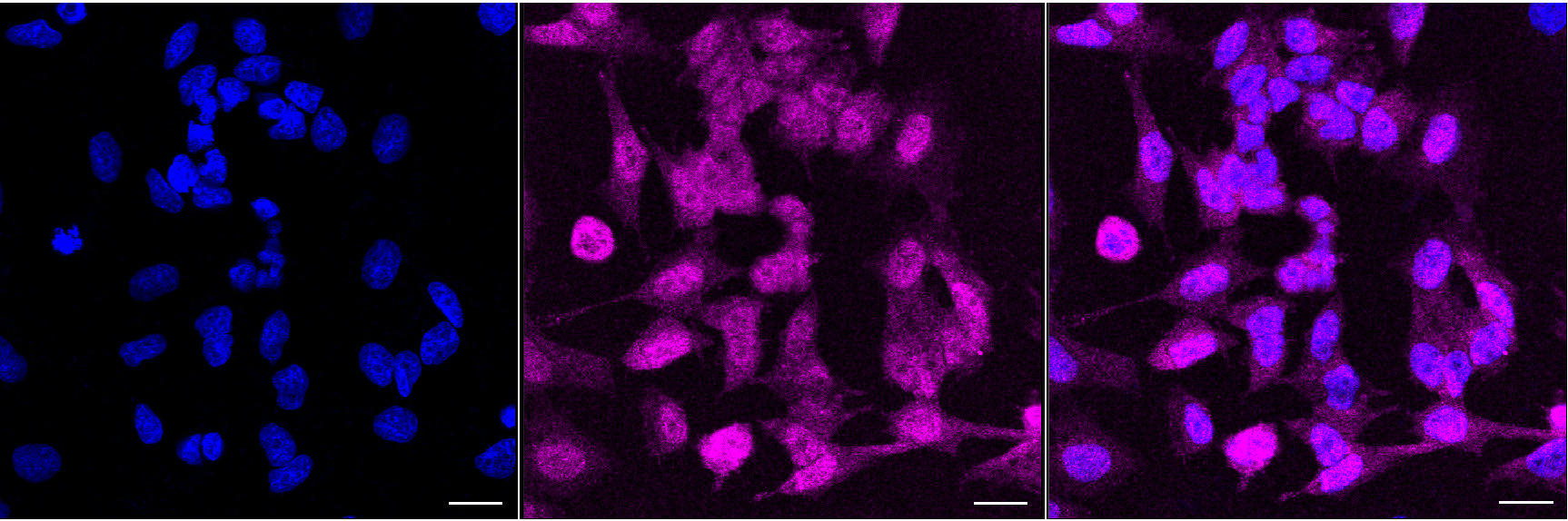 Immunocytochemical staining of HeLa cells with galectin 3 antibody. Nuclei were stained blue with DAPI; Galectin 3 was stained magenta with Alexa Fluor? 647. Images were taken using Leica stellaris 5. Protein abundance based on laser Intensity and smart gain: Medium. Scale bar, 20 μm.