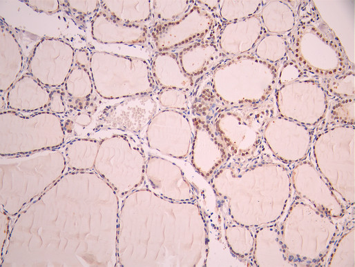 IHC image of CSB-RA163614A0HU diluted at 1:100 and staining in paraffin-embedded human thyroid tissue performed on a Leica BondTM system. After dewaxing and hydration, antigen retrieval was mediated by high pressure in a citrate buffer (pH 6.0). Section was blocked with 10% normal goat serum 30min at RT. Then primary antibody (1% BSA) was incubated at 4°C overnight. The primary is detected by a Goat anti-rabbit polymer IgG labeled by HRP and visualized using 0.05% DAB.