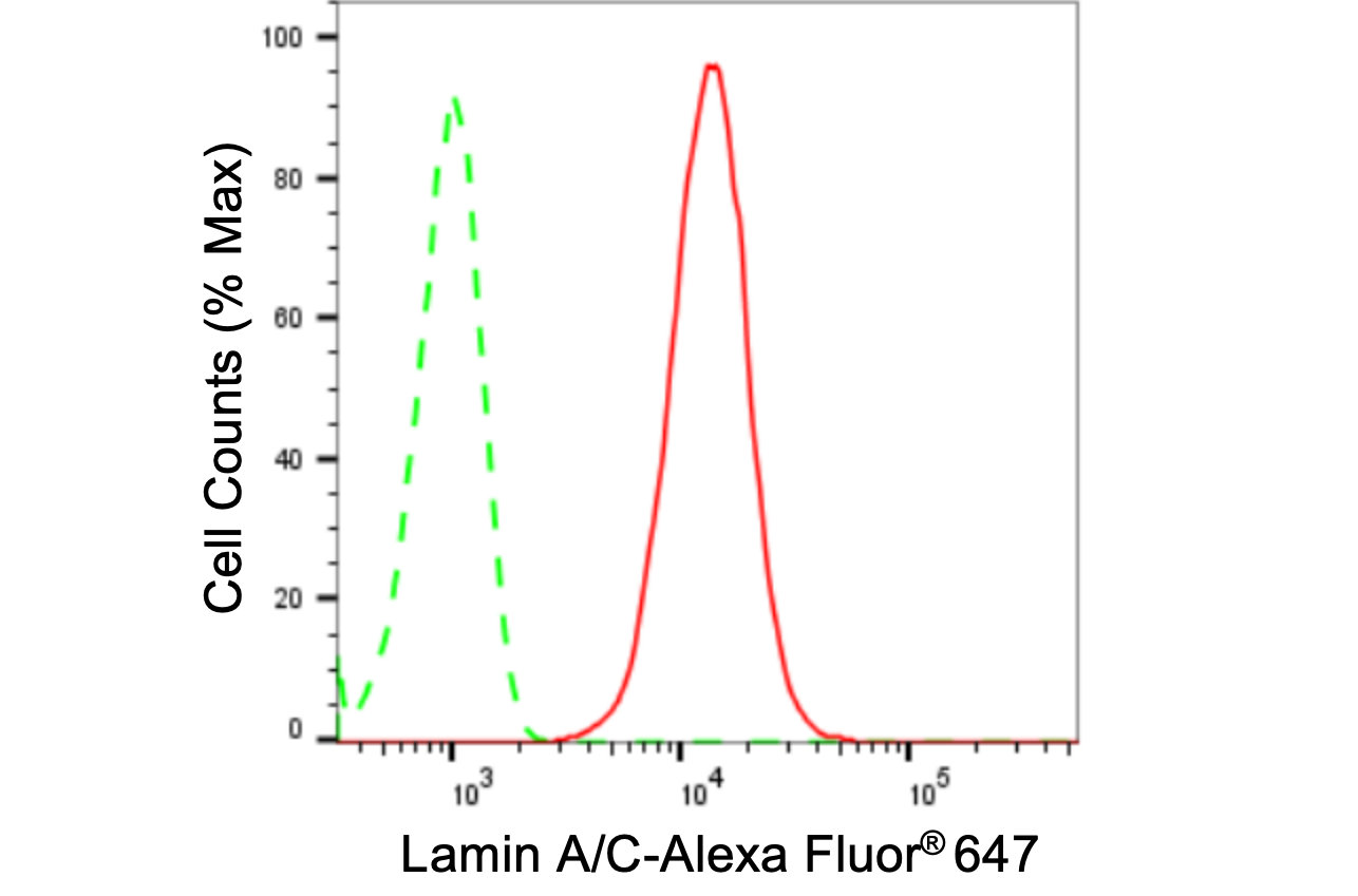 Flow cytometric analysis of Lamin A/C expression in C2C12 cells using Lamin A/C antibody. Green, isotype control; red, Lamin A/C.