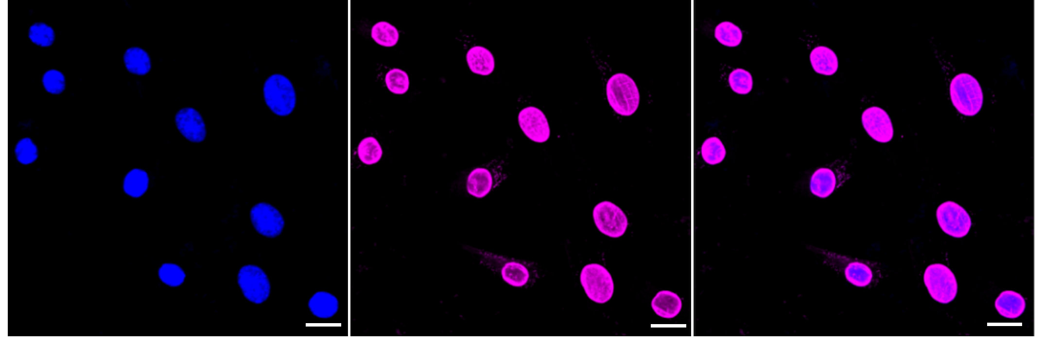 Immunocytochemical staining of C2C12 cells with Lamin A/C antibody. Nuclei were stained blue with DAPI; Lamin A/C was stained magenta with Alexa Fluor? 647. Images were taken using leica stellaris 5. Protein abundance based on laser intensity and smart gain: High. Scale bar: 20 μm.