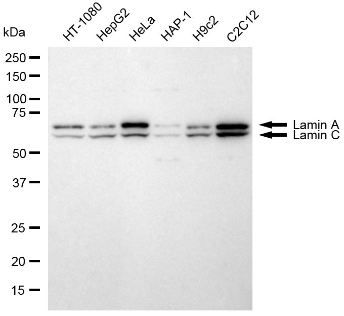 Western blotting analysis using Lamin A/C antibody. Total cell lysates (30 μg) from various cell lines were loaded and separated by SDS-PAGE. The blot was incubated with Lamin A/C antibody and HRP-conjugated goat anti-rabbit secondary antibody respectively.