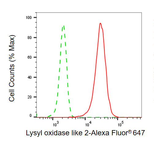Flow cytometric analysis of Lysyl oxidase like 2 expression in HepG2 cells using Lysyl oxidase like 2 antibody. Green, isotype control; red, Lysyl oxidase like 2.