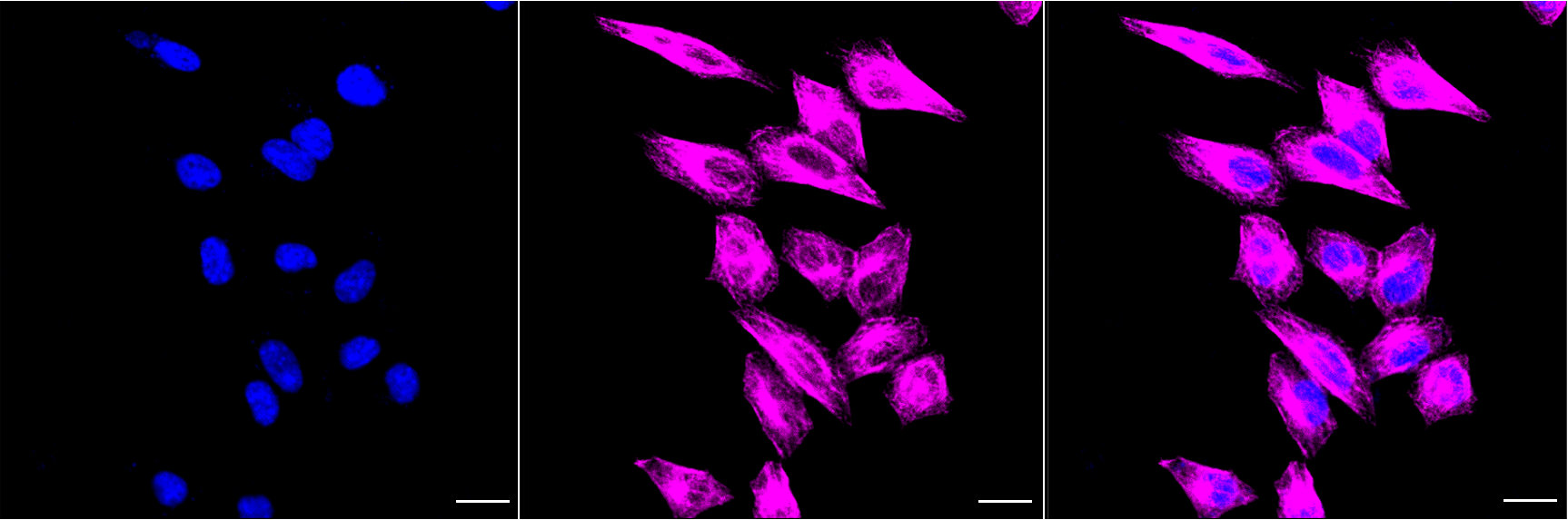 Immunocytochemical staining of HepG2 cells with Lysyl oxidase like 2 antibody. Nuclei were stained blue with DAPI; Lysyl oxidase like 2 was stained magenta with Alexa Fluor? 647. Images were taken using Leica stellaris 5. Protein abundance based on laser Intensity and smart gain: Medium. Scale bar, 20 μm.