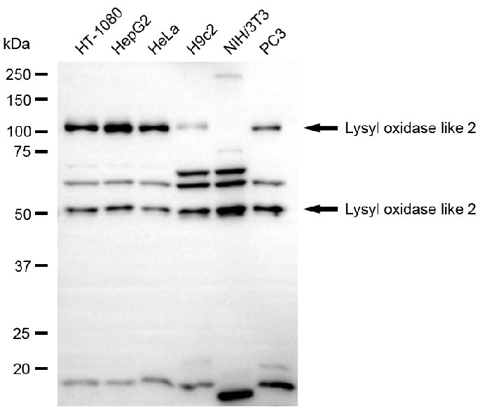 Western blotting analysis using lysyl oxidase like 2 antibody. Total cell lysates (30 μg) from various cell lines were loaded and separated by SDS-PAGE. The blot was incubated with lysyl oxidase like 2 antibody and HRP-conjugated goat anti-rabbit secondary antibody respectively.