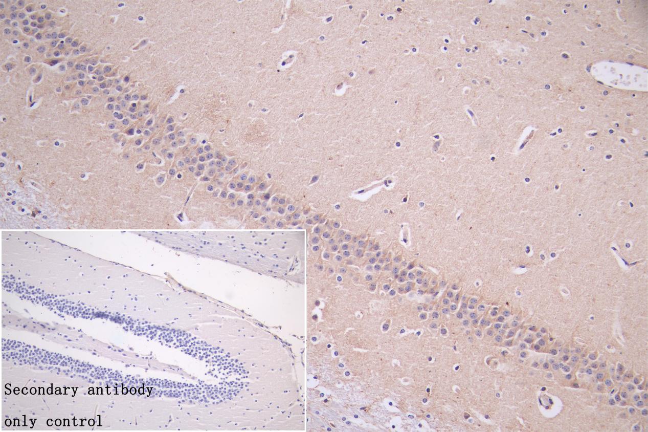IHC image of CSB-RA794688HU diluted at 1:150 and staining in paraffin-embedded mouse brain tissue performed on a Leica BondTM system. After dewaxing and hydration, antigen retrieval was mediated by high pressure in a citrate buffer (pH 6.0). Section was blocked with 10% normal goat serum 30min at RT. Then primary antibody (1% BSA) was incubated at 4°C overnight. The primary is detected by a Goat anti-rabbit polymer IgG labeled by HRP and visualized using 0.05% DAB. Secondary antibody only control: uses 1% BSA instead of primary antibody.
