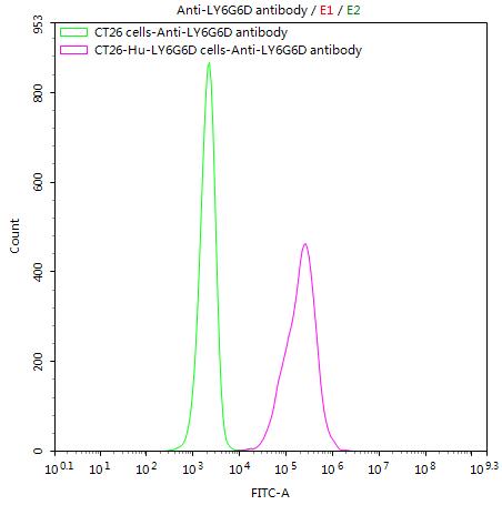 Untransfected CT26 cells (green line) and transfected Human LY6G6D CT26 stable cells (red line) were stained with anti-LY6G6D antibody (CSB-RA013246MA4MO) (2μg/1*106cells), washed and then followed by FITC-conjugated anti-Mouse IgG Fc antibody and analyzed with flow cytometry.