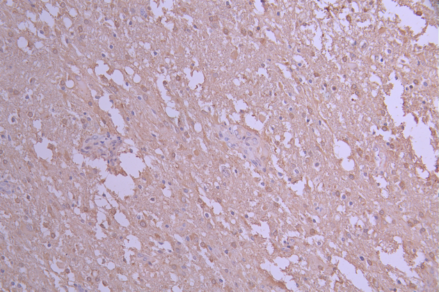IHC image of CSB-RA616977A0HU diluted at 1:100 and staining in paraffin-embedded human glioma cancer performed on a Leica BondTM system. After dewaxing and hydration, antigen retrieval was mediated by high pressure in a citrate buffer (pH 6.0). Section was blocked with 10% normal goat serum 30min at RT. Then primary antibody (1% BSA) was incubated at 4°C overnight. The primary is detected by a Goat anti-rabbit polymer IgG labeled by HRP and visualized using 0.05% DAB.