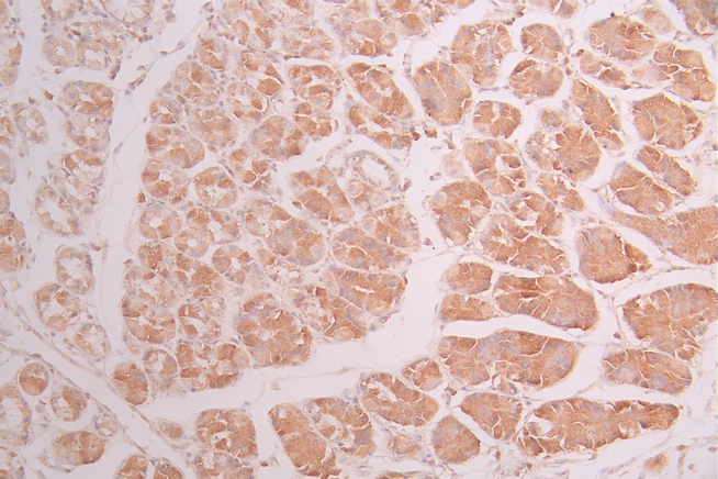 IHC image of CSB-RA597007A0HU diluted at 1:100 and staining in paraffin-embedded human stomach tissue performed on a Leica BondTM system. After dewaxing and hydration, antigen retrieval was mediated by high pressure in a citrate buffer (pH 6.0). Section was blocked with 10% normal goat serum 30min at RT. Then primary antibody (1% BSA) was incubated at 4°C overnight. The primary is detected by a Goat anti-rabbit polymer IgG labeled by HRP and visualized using 0.05% DAB.