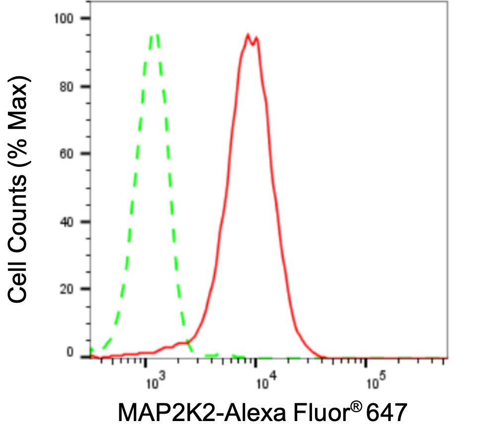 Flow cytometric analysis of MAP2K2 expression in HepG2 cells using MAP2K2 antibody. Green, isotype control; red, MAP2K2.