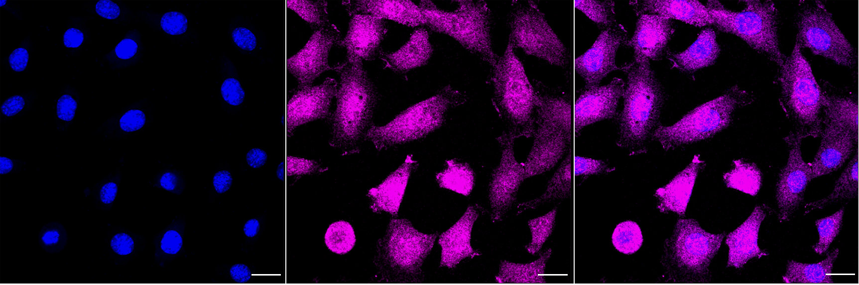 Immunocytochemical staining of C2C12 cells with MAP2K3 antibody. Nuclei were stained blue with DAPI; MAP2K3 was stained magenta with Alexa Fluor? 647. Images were taken using Leica stellaris 5. Protein abundance based on laser Intensity and smart gain: Medium. Scale bar, 20 μm.