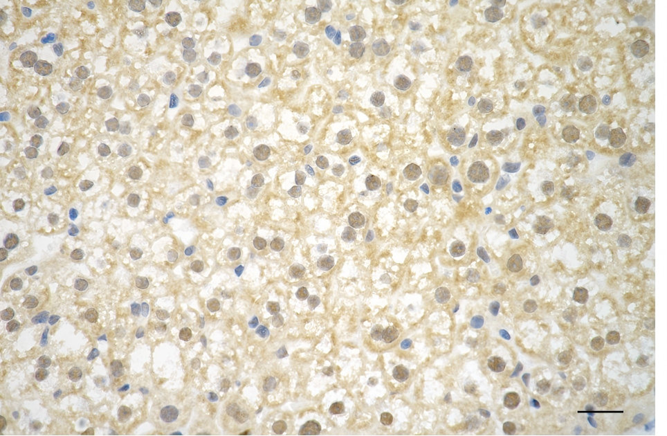 Immunohistochemistry was performed on paraffin-embedded mouse liver using MAP2K3 antibody. Antigen retrieval was done in sodium citrate buffer (pH 6.0). DAB was used for detection, with hematoxylin counterstaining. Images were acquired using a Nikon Ci-L Plus microscope (40× objective). Scale bar: 25 μm.
