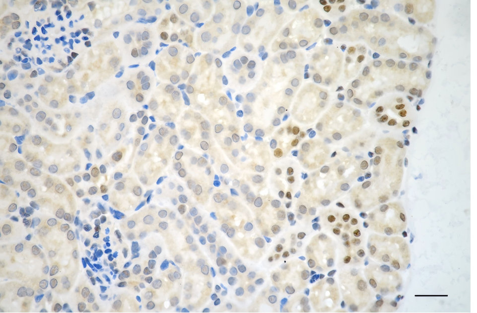 Immunohistochemistry was performed on paraffin-embedded mouse kidney using MAP2K3 antibody. Antigen retrieval was done in sodium citrate buffer (pH 6.0). DAB was used for detection, with hematoxylin counterstaining. Images were acquired using a Nikon Ci-L Plus microscope (40× objective). Scale bar: 25 μm.
