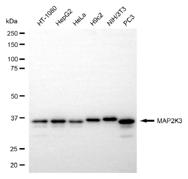 Western blotting analysis using MAP2K3 antibody. Total cell lysates (30 μg) from various cell lines were loaded and separated by SDS-PAGE. The blot was incubated with MAP2K3 antibody and HRP-conjugated goat anti-rabbit secondary antibody respectively.