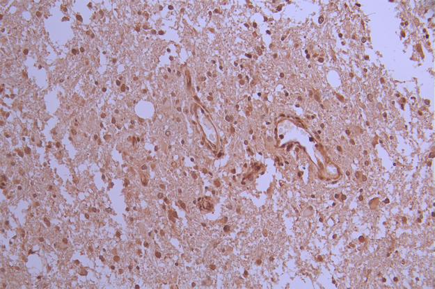 IHC image of CSB-RA590869A0HU diluted at 1:100 and staining in paraffin-embedded human glioma cancer performed on a Leica BondTM system. After dewaxing and hydration, antigen retrieval was mediated by high pressure in a citrate buffer (pH 6.0). Section was blocked with 10% normal goat serum 30min at RT. Then primary antibody (1% BSA) was incubated at 4°C overnight. The primary is detected by a Goat anti-rabbit polymer IgG labeled by HRP and visualized using 0.05% DAB.
