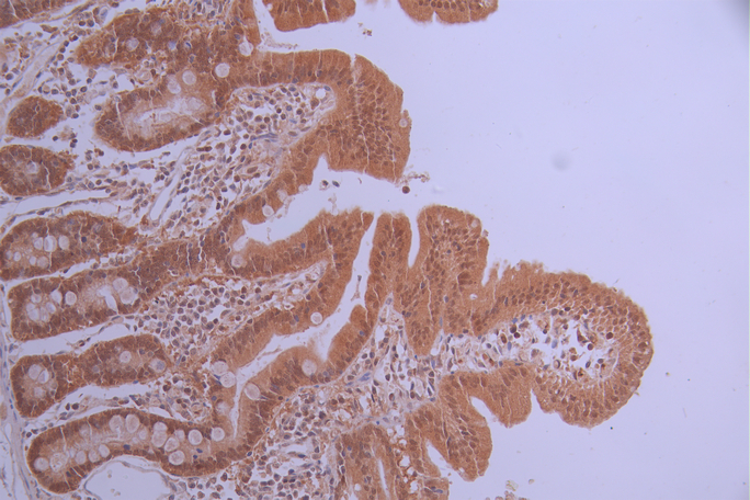 IHC image of CSB-RA590869A0HU diluted at 1:100 and staining in paraffin-embedded human small intestine tissue performed on a Leica BondTM system. After dewaxing and hydration, antigen retrieval was mediated by high pressure in a citrate buffer (pH 6.0). Section was blocked with 10% normal goat serum 30min at RT. Then primary antibody (1% BSA) was incubated at 4°C overnight. The primary is detected by a Goat anti-rabbit polymer IgG labeled by HRP and visualized using 0.05% DAB.