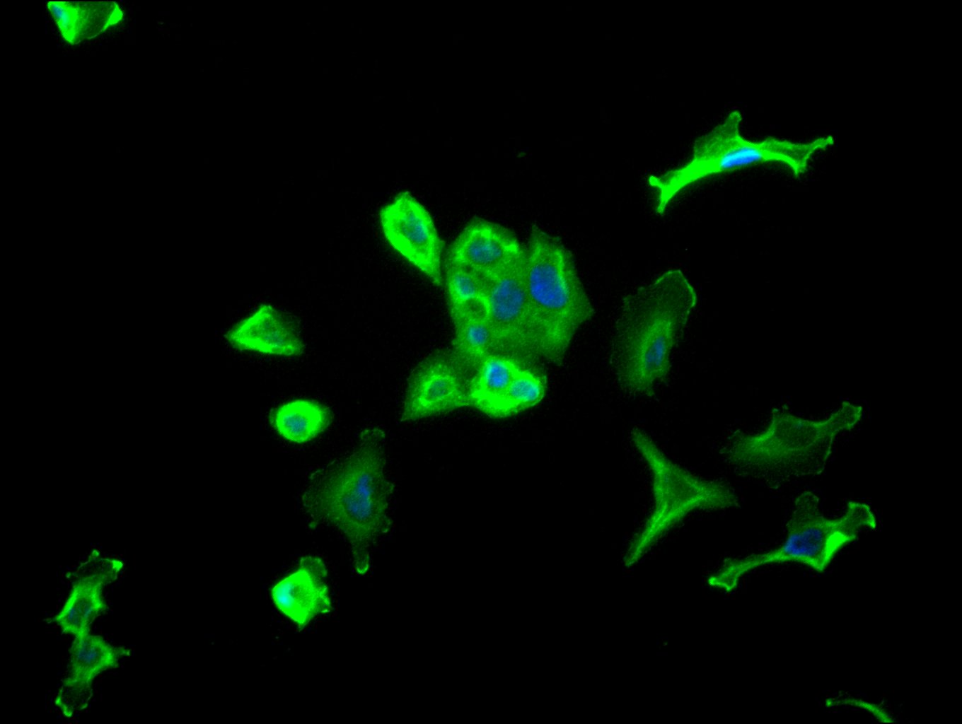 Immunofluorescence staining of HepG2 cell with CSB-RA563777A0HU at 1:50, counter-stained with DAPI. The cells were fixed in 4% formaldehyde, permeabilized using 0.2% Triton X-100 and blocked in 10% normal Goat Serum. The cells were then incubated with the antibody overnight at 4°C. The secondary antibody was Alexa Fluor 488-congugated AffiniPure Goat Anti-Rabbit IgG(H+L).