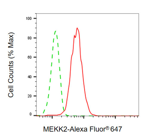 Flow cytometric analysis of MEKK2 expression in HepG2 cells using MEKK2 antibody (. Green, isotype control; red, MEKK2.