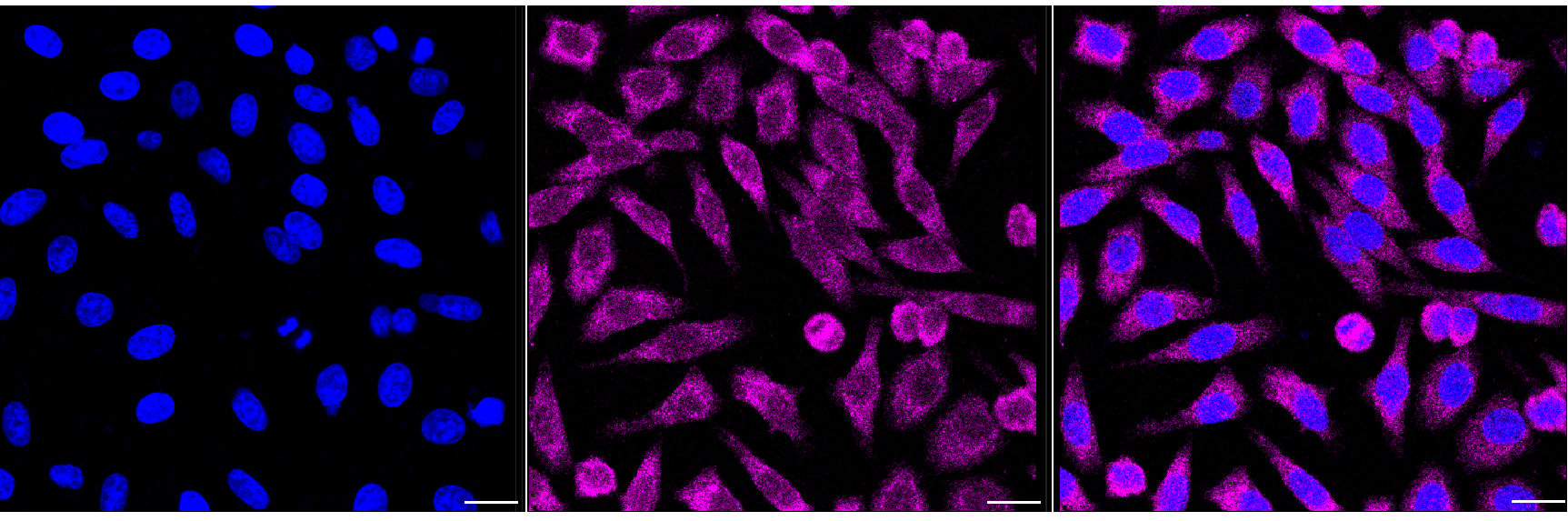Immunocytochemical staining of Hela cells with MEKK2 antibody (. Nuclei were stained blue with DAPI; MEKK2 was stained magenta with Alexa Fluor? 647. Images were taken using Leica stellaris 5. Protein abundance based on laser Intensity and smart gain: Medium. Scale bar, 20 μm.