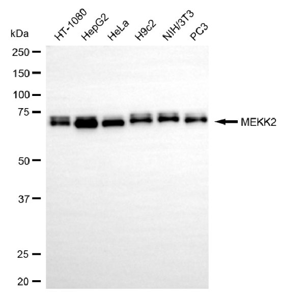 Western blotting analysis using MEKK2 antibody. Total cell lysates (30 μg) from various cell lines were loaded and separated by SDS-PAGE. The blot was incubated with MEKK2 antibody and HRP-conjugated goat anti-rabbit secondary antibody respectively.