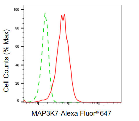 Flow cytometric analysis of MAP3K7 expression in HeLa cells using MAP3K7 antibody. Green, isotype control; red, MAP3K7.