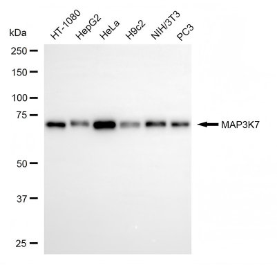Western blotting analysis using MAP3K7 antibody. Total cell lysates (30 μg) from various cell lines were loaded and separated by SDS-PAGE. The blot was incubated with MAP3K7 antibody and HRP-conjugated goat anti-rabbit secondary antibody respectively.
