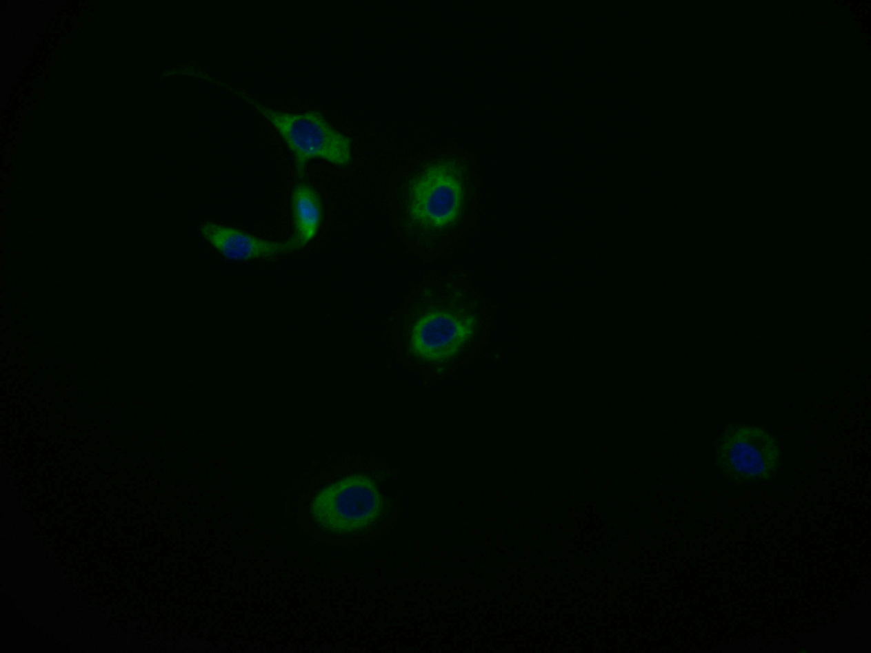 Immunofluorescence staining of Hela cell with CSB-RA971033A0HU at 1:50, counter-stained with DAPI. The cells were fixed in 4% formaldehyde and blocked in 10% normal Goat Serum. The cells were then incubated with the antibody overnight at 4°C. The secondary antibody was Alexa Fluor 595-congugated AffiniPure Goat Anti-Rabbit IgG(H+L).