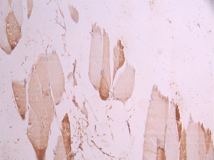 IHC image of CSB-RA283068A0HU diluted at 1:100 and staining in paraffin-embedded human skeletal muscle tissue performed on a Leica BondTM system. After dewaxing and hydration, antigen retrieval was mediated by high pressure in a citrate buffer (pH 6.0). Section was blocked with 10% normal goat serum 30min at RT. Then primary antibody (1% BSA) was incubated at 4°C overnight. The primary is detected by a Goat anti-rabbit polymer IgG labeled by HRP and visualized using 0.05% DAB.