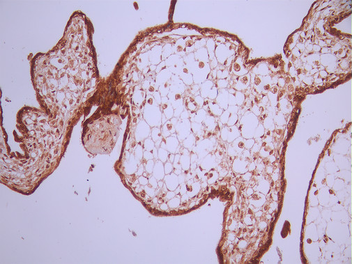 IHC image of CSB-RA072670A0HU diluted at 1:100 and staining in paraffin-embedded human placenta tissue performed on a Leica BondTM system. After dewaxing and hydration, antigen retrieval was mediated by high pressure in a citrate buffer (pH 6.0). Section was blocked with 10% normal goat serum 30min at RT. Then primary antibody (1% BSA) was incubated at 4°C overnight. The primary is detected by a Goat anti-rabbit polymer IgG labeled by HRP and visualized using 0.05% DAB.
