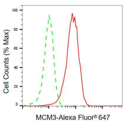 Flow cytometric analysis of MCM3 expression in HepG2 cells using MCM3 antibody. Green, isotype control; red, MCM3.