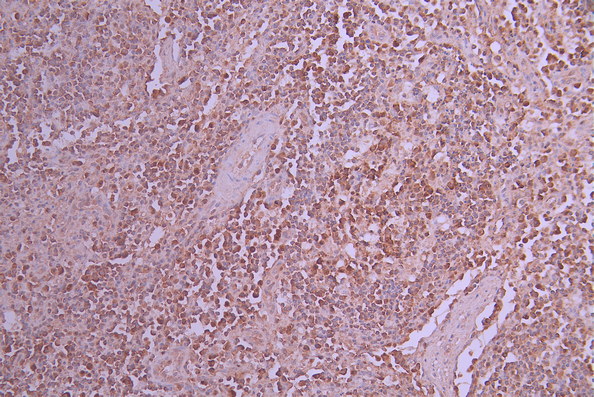 IHC image of CSB-RA986091A0HU diluted at 1:100 and staining in paraffin-embedded human lymph node tissue performed on a Leica BondTM system. After dewaxing and hydration, antigen retrieval was mediated by high pressure in a citrate buffer (pH 6.0). Section was blocked with 10% normal goat serum 30min at RT. Then primary antibody (1% BSA) was incubated at 4°C overnight. The primary is detected by a Goat anti-rabbit polymer IgG labeled by HRP and visualized using 0.05% DAB.